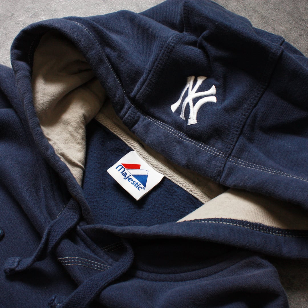 フロントにニューヨークヤンキースの文字が刺繍され、袖にヤンキースのワッペン、マジェスティックスのロゴが刺繍されたいなたさを漂わせる一着。