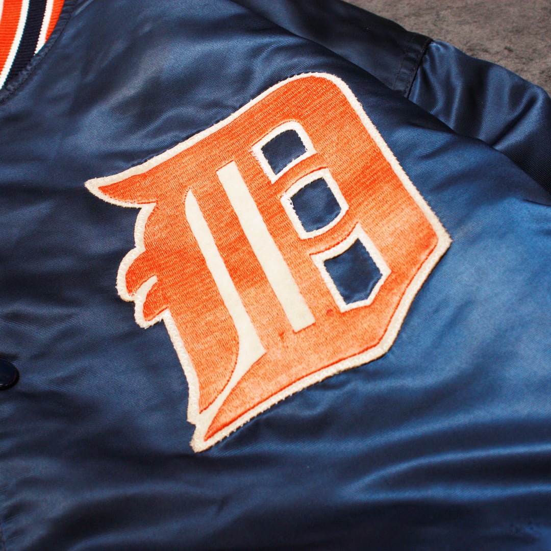 VINTAGE STARTERのスタジアムジャケット、タイガースの重圧感あるロゴ刺繍が特徴的。