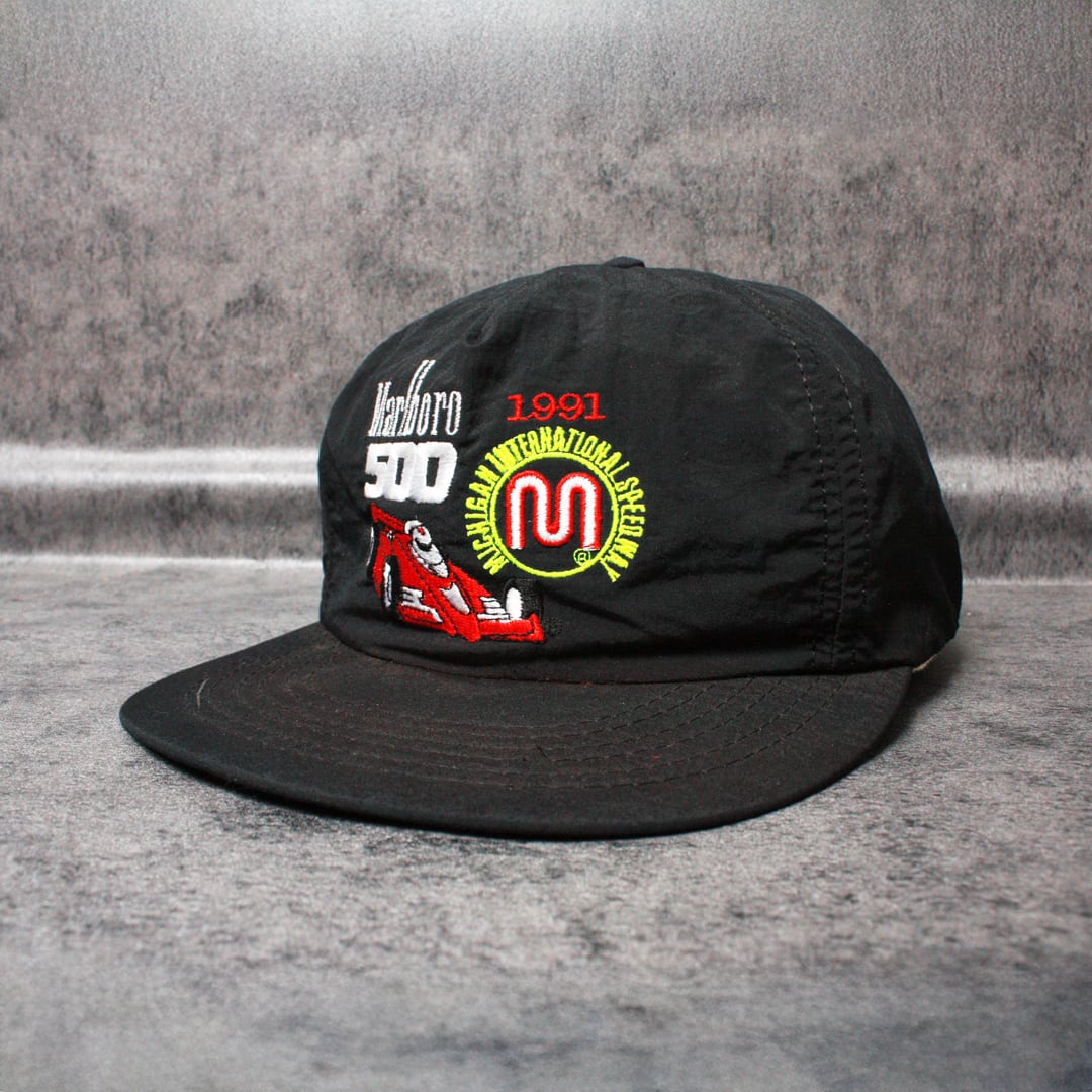 RACING TEAMを元にしたデザインで、マルボロのロゴデザインにレースのカーマシンが刺繍されたレアなタバコ関連キャップ。