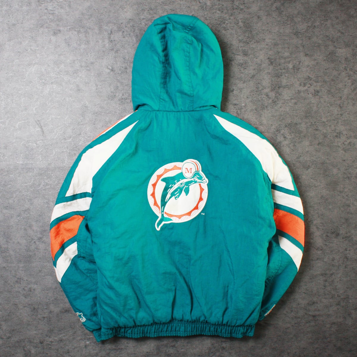 STARTER スターター MIA DOLPHINSのナイロンジャケットです。Made in Korea製で背中のチームロゴ刺繍が目を引くアイテムです。裏地はキルティングになっており中綿が入っているので保温性も抜群。背中のチームロゴに若干のシミがありますが古着慣れしている方であれば着用に問題ない程度です。