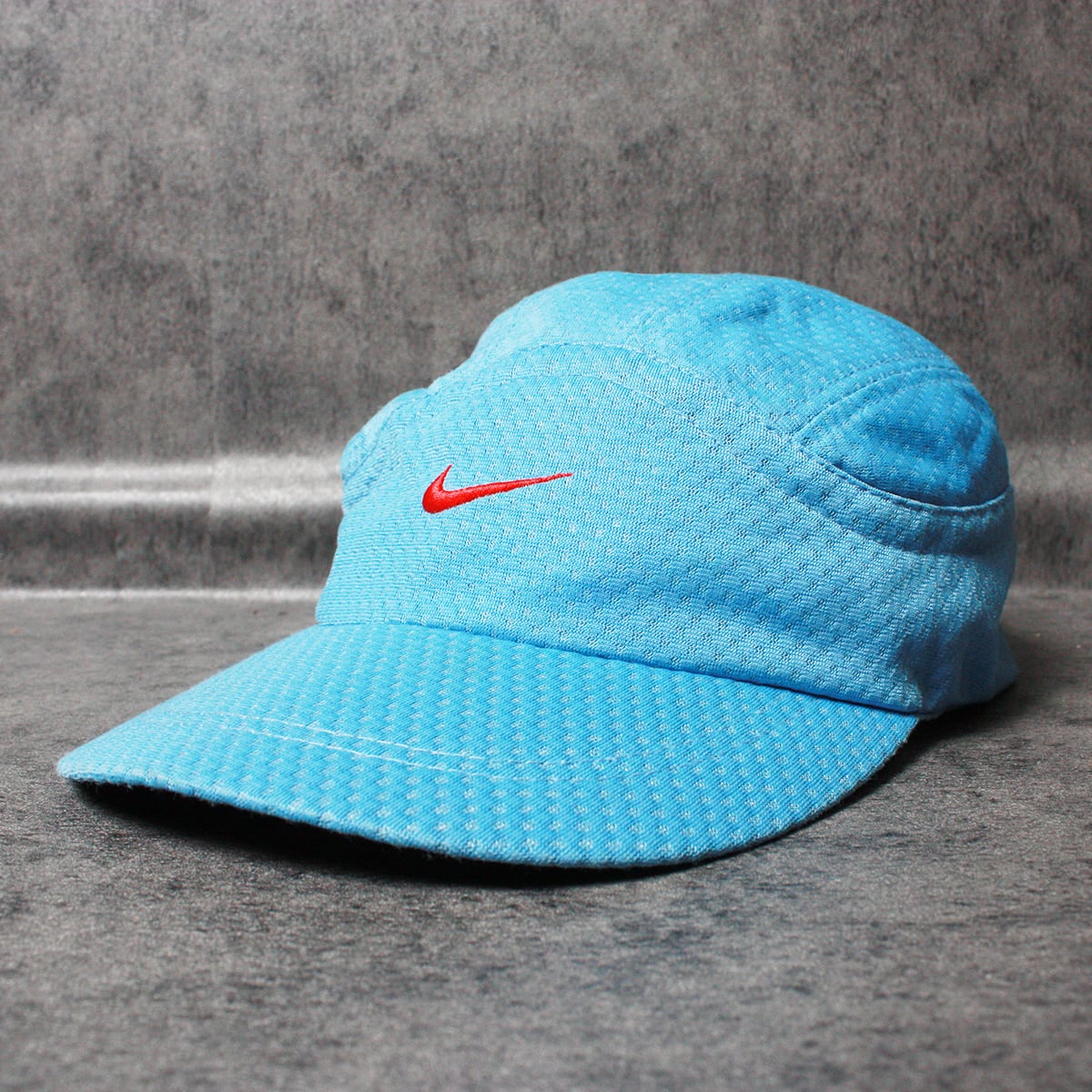 NIKE ナイキのスナップバックキャップです。ライトブルーにレッドのスウォッシュが映えるアイテムです。ポリエステルのメッシュ素材になっており通気性に優れています。