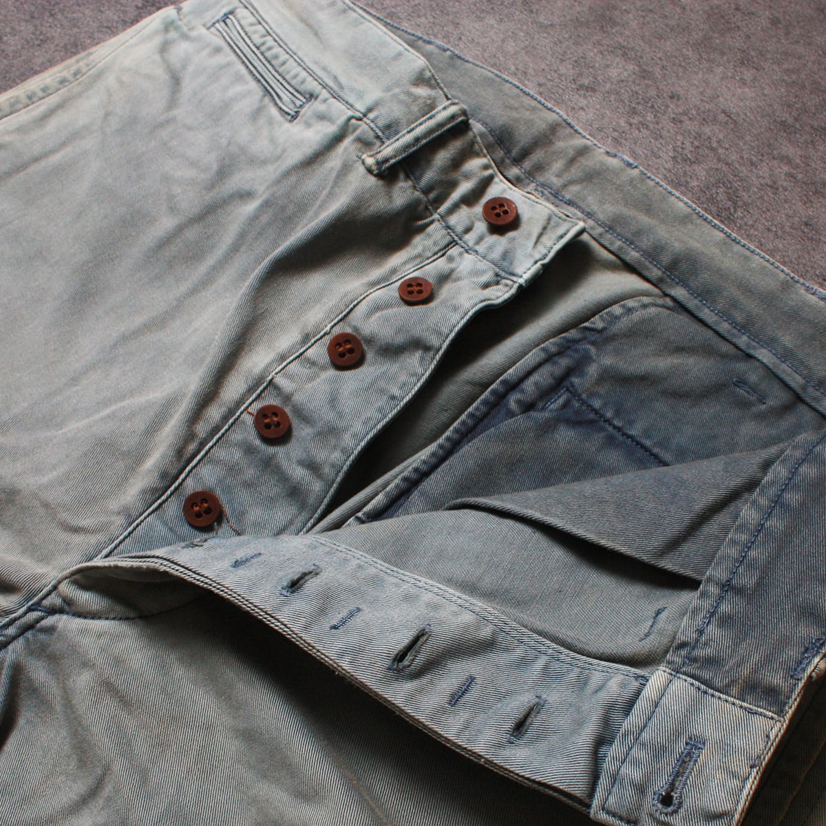 RRL ダブルアールエルのチノパンツです。RRLはヴィンテージスタイルに特化していることもありこちらのパンツも古き良き使用感のあるパンツになります。ジッパーではなくボタンフライになっている点もRRLのこだわりが感じられます。全体的な色褪せはありますが生地が丈夫で気になるダメージもないためまだまだ着用いただけます。(擦れはもともとRRLでダメージ加工されています)
