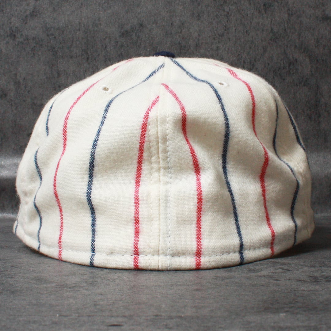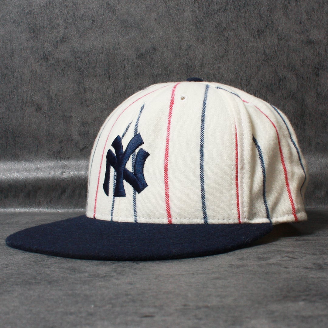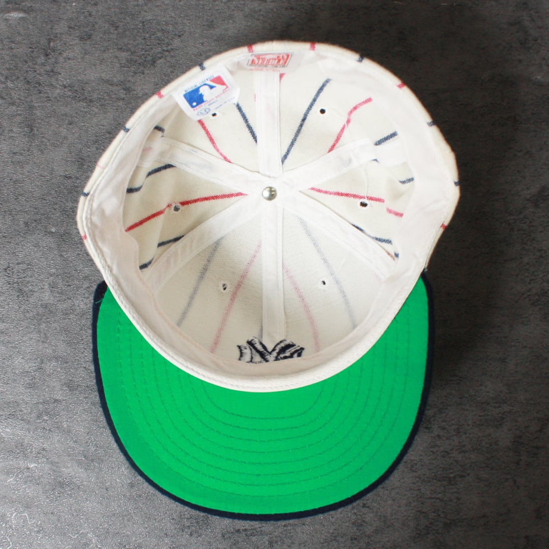 NY YANKEESのロゴが正面に刺繍され、落ち着いたレッドとブルーがストライプ状にデザイン。