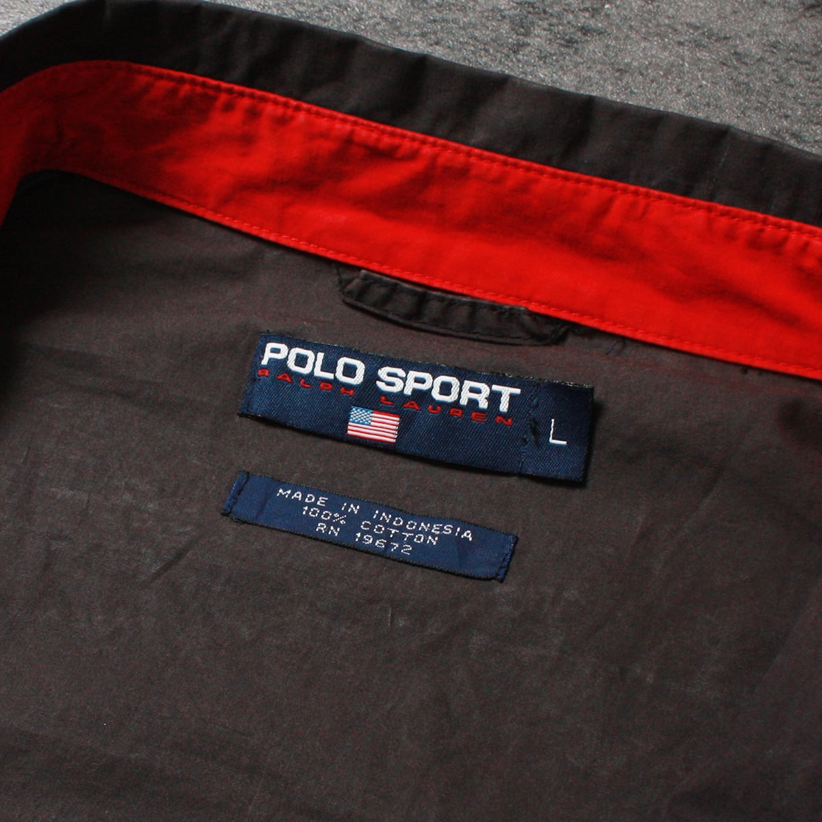 POLO SPORT ポロスポーツのコットンジャケットです。シンプルなブラックのメインカラーにロゴと襟の赤の差し色が目を引くアイテムです。薄手の生地なので肌寒い季節にさらっと羽織れます。
