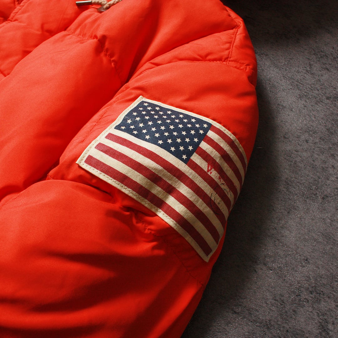 Polo by Ralph Laurenのダウンジャケットです。落ち着いたオレンジ色が印象的な一品でビンテージ感のあるアイテムです。ジッパーはConmar製で、ボタンは大きめのシェルボタンが使用されています。ダウンもしっかり入っているので保温性も抜群です。