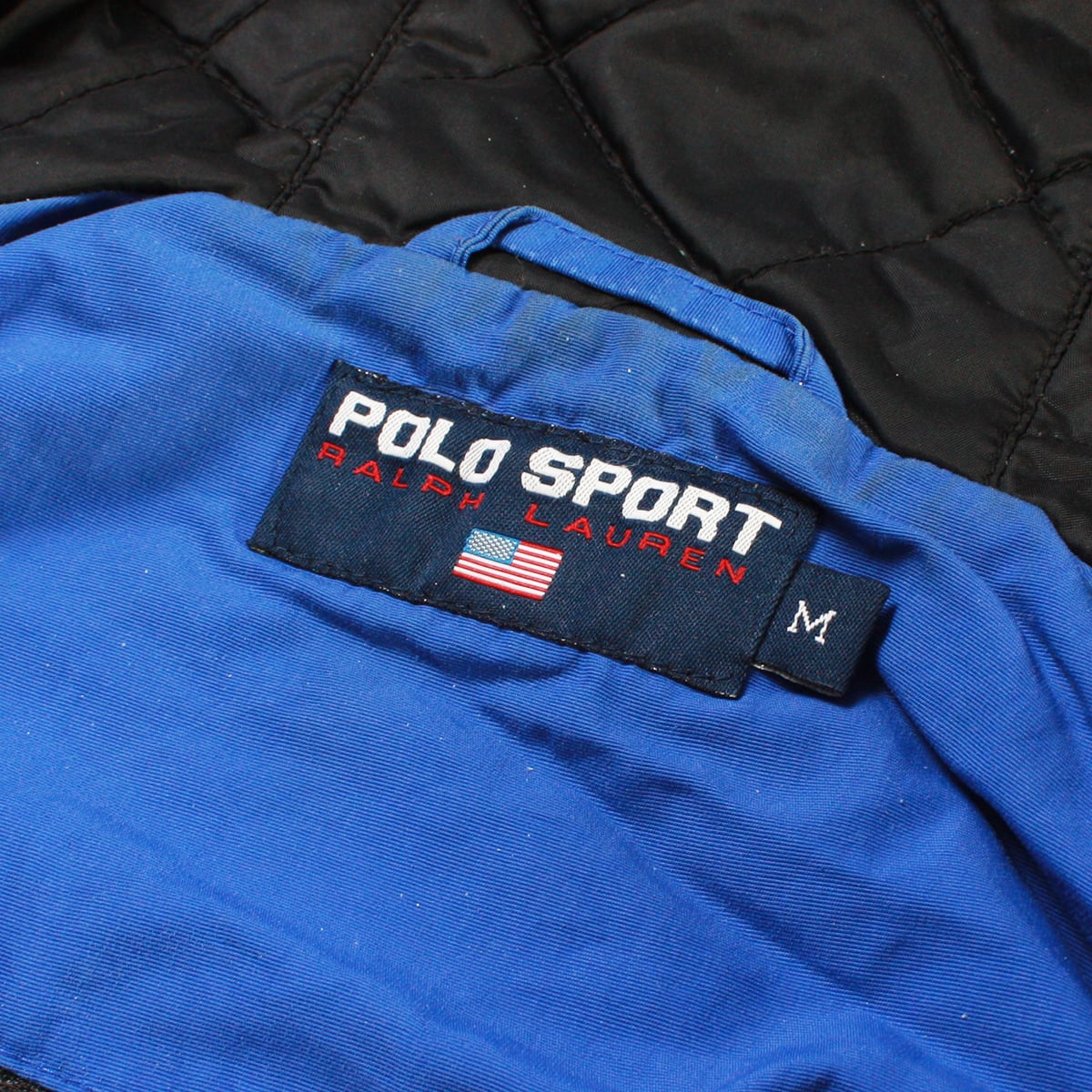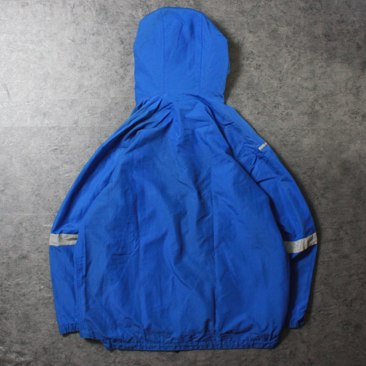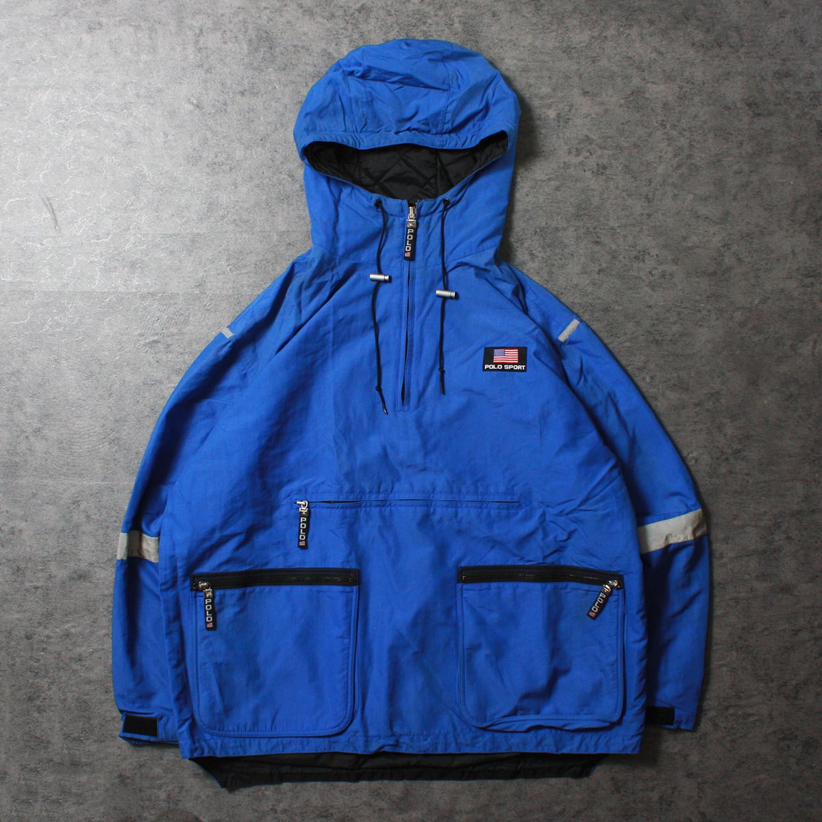 POLO SPORT ポロスポーツのナイロンアノラックジャケットです。POLO SPORTらしい鮮やかなブルーに両肩・両袖に入ったリフレクターが特徴的な一品。左右のポケットに加えカンガルーポケットもついており収納力も兼ね備えています。両袖はマジックテープ、裾にはドローコードが付いているので防寒対策も抜群です。右袖のリフレクターに若干の汚れがありますが古着慣れしている方でしたら問題なく着用いただけます。