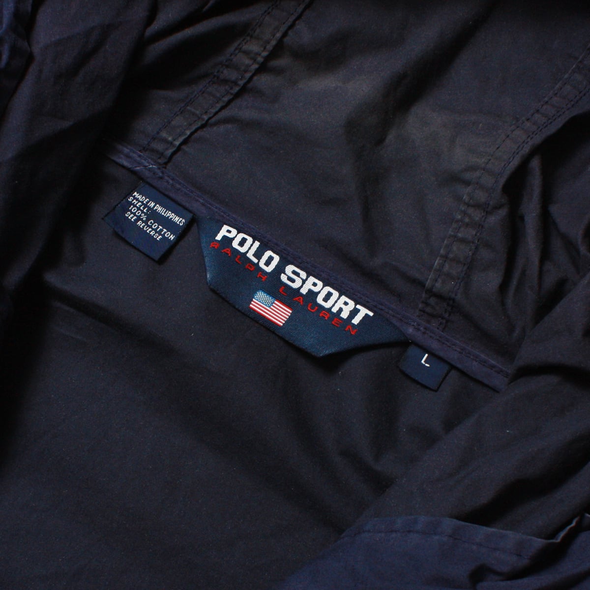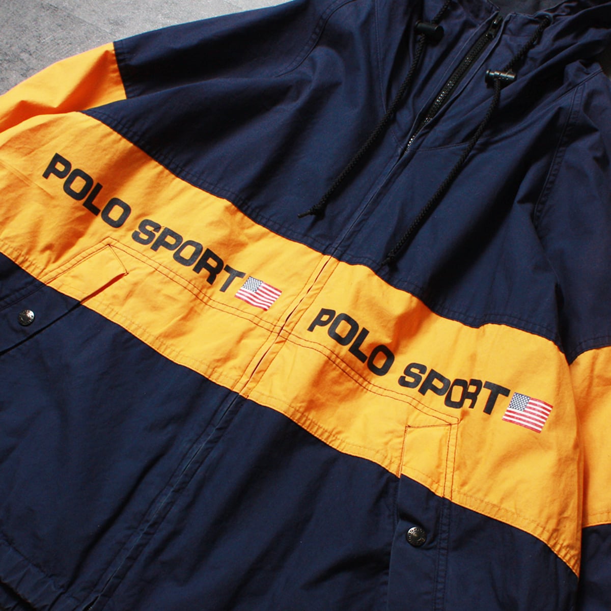 POLO SPORT ポロスポーツのコットンジャケットです。ネイビーとイエローの配色に『POLO SPORT』のロゴが目を引くアイテム。貴重な90sのアイテムです。コットン素材なので着心地も軽く肌寒い季節にさらっと着用いただける一品です。