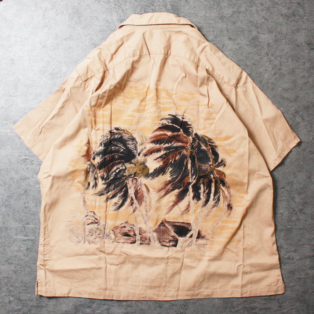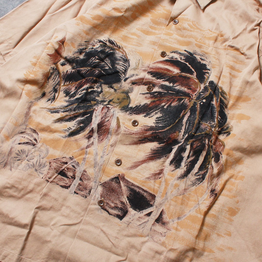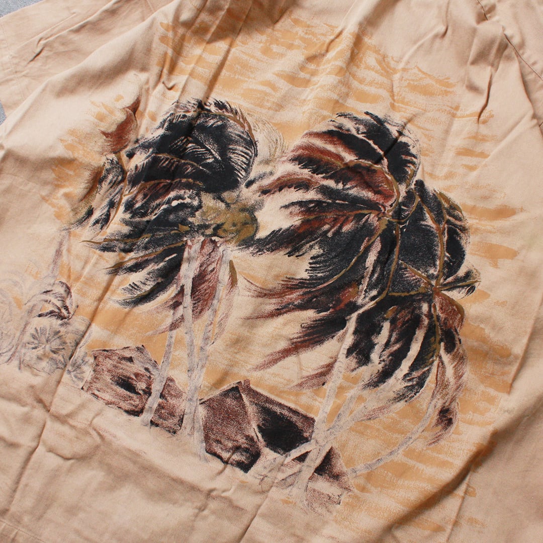 暖かみを感じるベージュにプリントされたヤシの木が夏を彷彿とさせる一着。