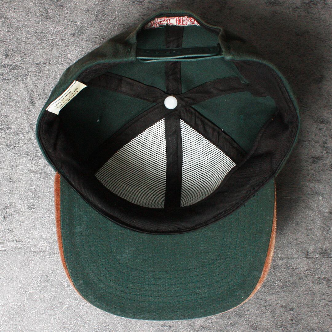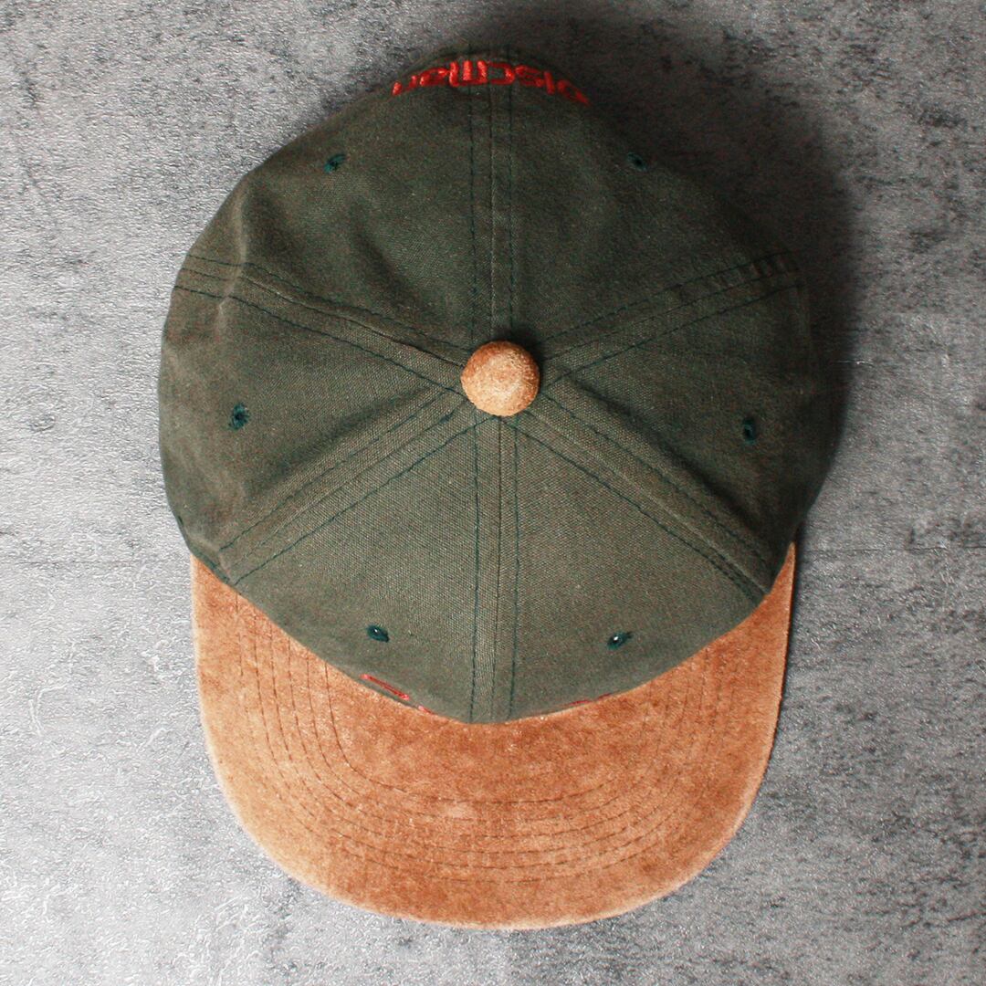 オリーブとブラウンのピッグレザー(豚革)素材のバイザーが落ち着いたシックな質感を演出。