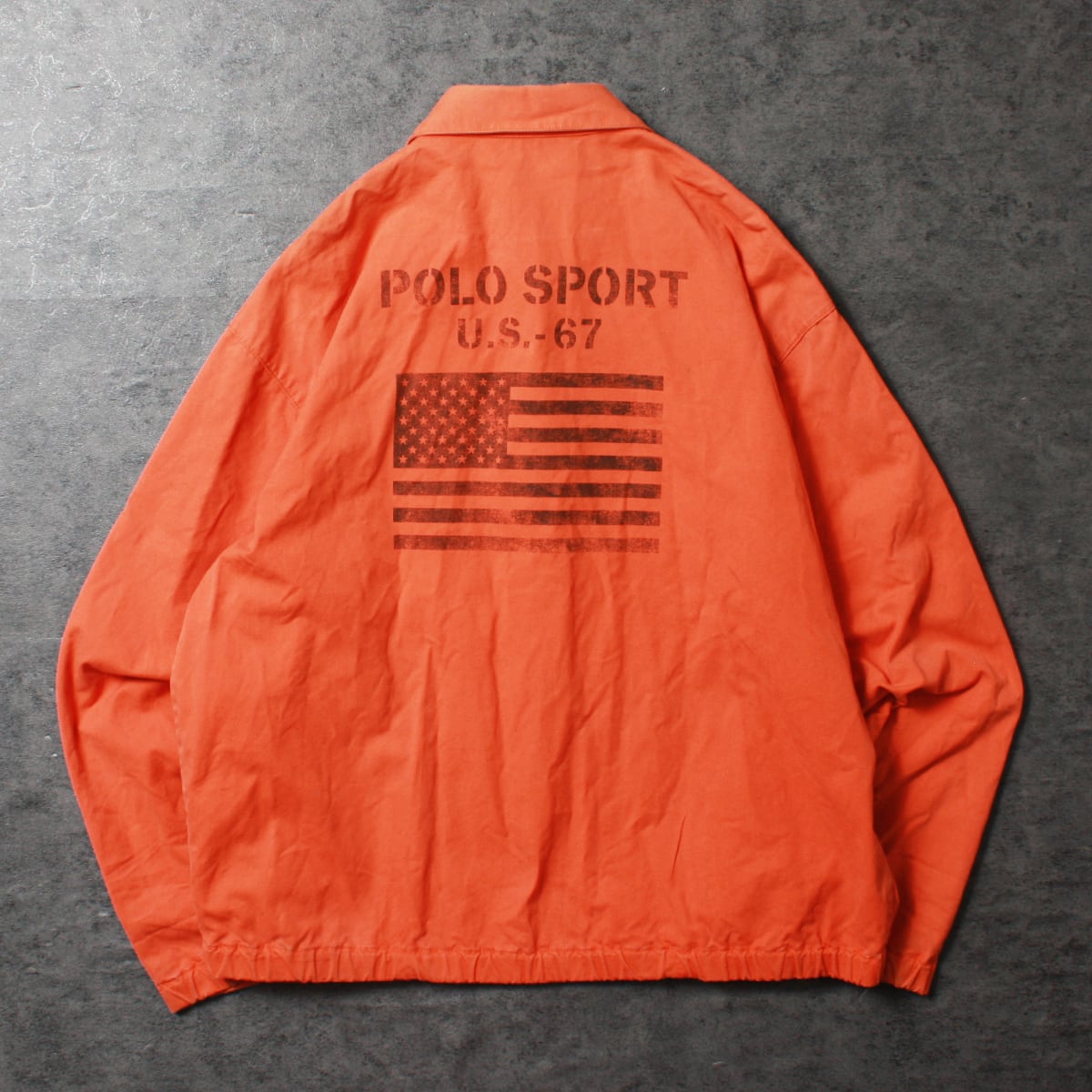POLO SPORT ポロスポーツのコットンジャケットです。背中のロゴが目を引くアイテム。スイングトップで薄手なので春先や秋口にさらっと羽織れる一品です。全体的に色褪せ、若干の汚れはありますが古着慣れしている方でしたら問題なく着用いただけます。