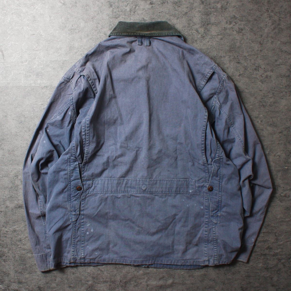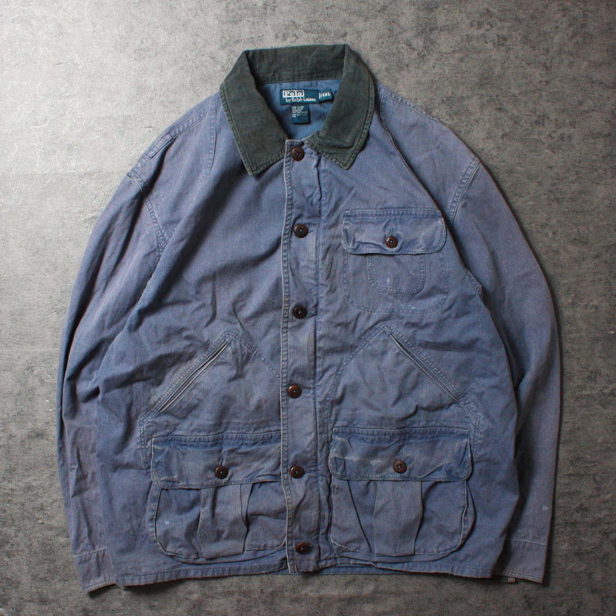 Polo Ralph Lauren ポロラルフローレンのコットンジャケットです。ハンディングジャケットの様な仕様となっており背中の大きなポケットが特徴的です。全体的な色褪せや所々にあるシミがビンテージ感を漂わせます。古着慣れしている方でしたら問題なく着用いただける一品です。