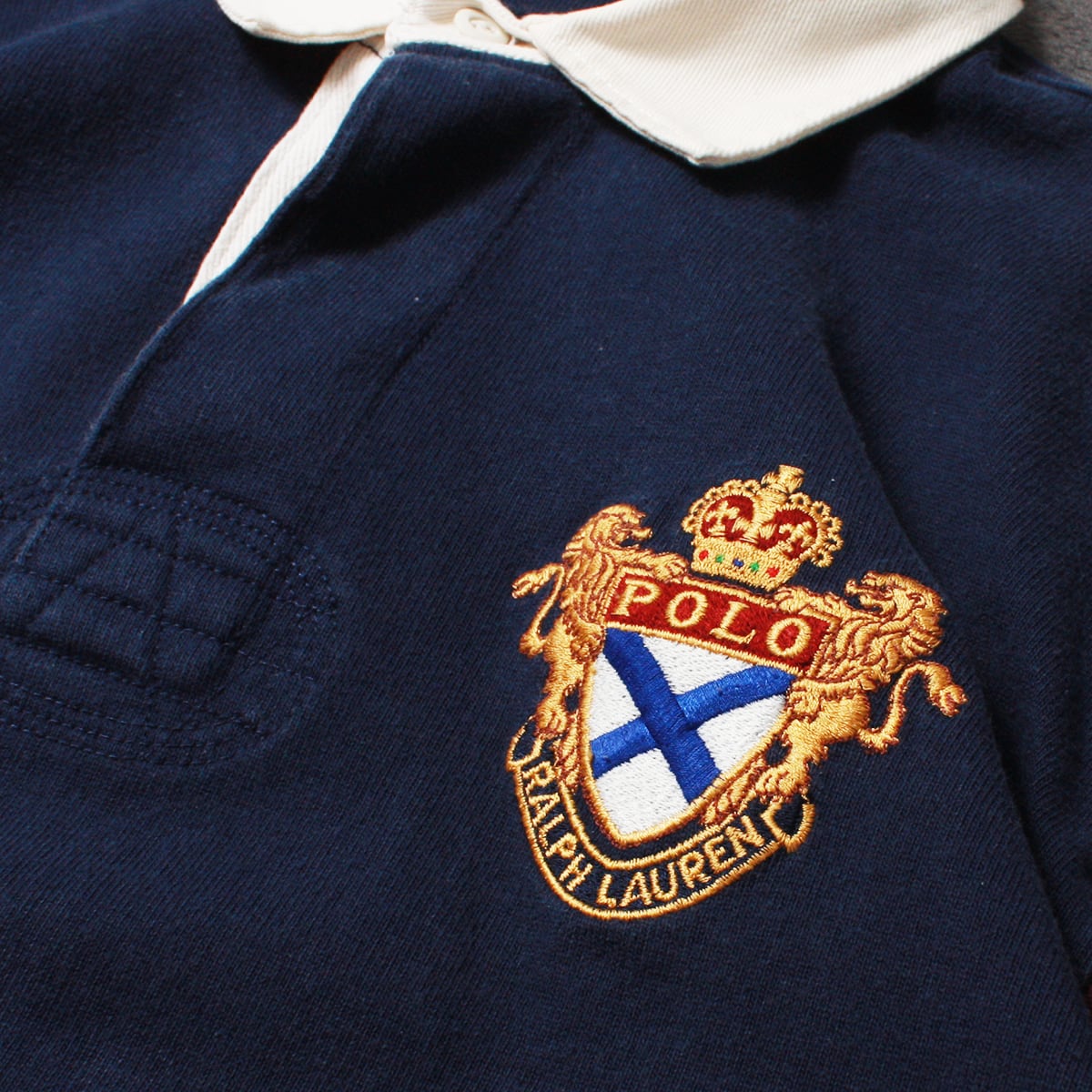 Polo by Ralph Lauren ポロバイラルフローレンのラガーシャツです。落ち着いたネイビーとボルドーのボディーに胸元の刺繍と裾のパッチが目を引くアイテム。肌寒い季節にさらっと着用いただけます。