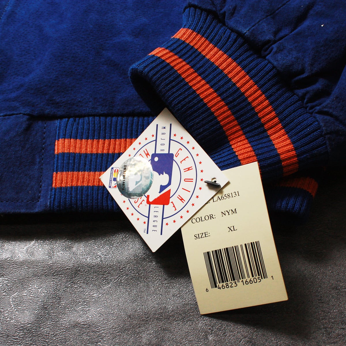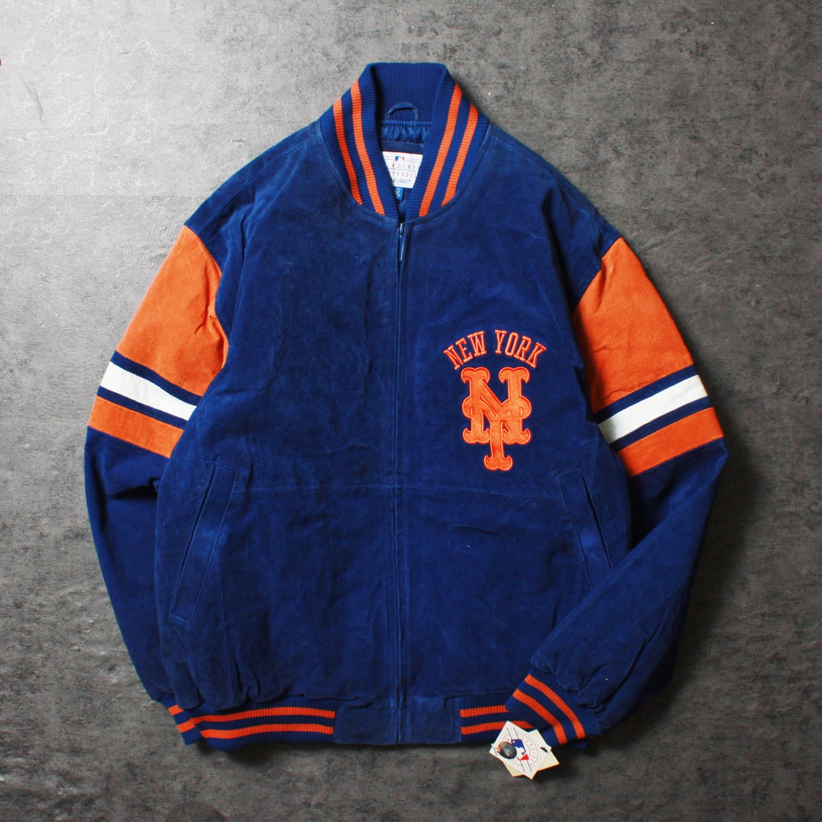 NEW YORK METS ニューヨークメッツのスタジャンです。メインボディーがベロアの様なレザーという珍しいアイテムで、ブルー x オレンジの配色と背中のパッチが目を引きます。タグ付きの未使用品につき汚れ、穴などのダメージはなく状態は極めて良好です。