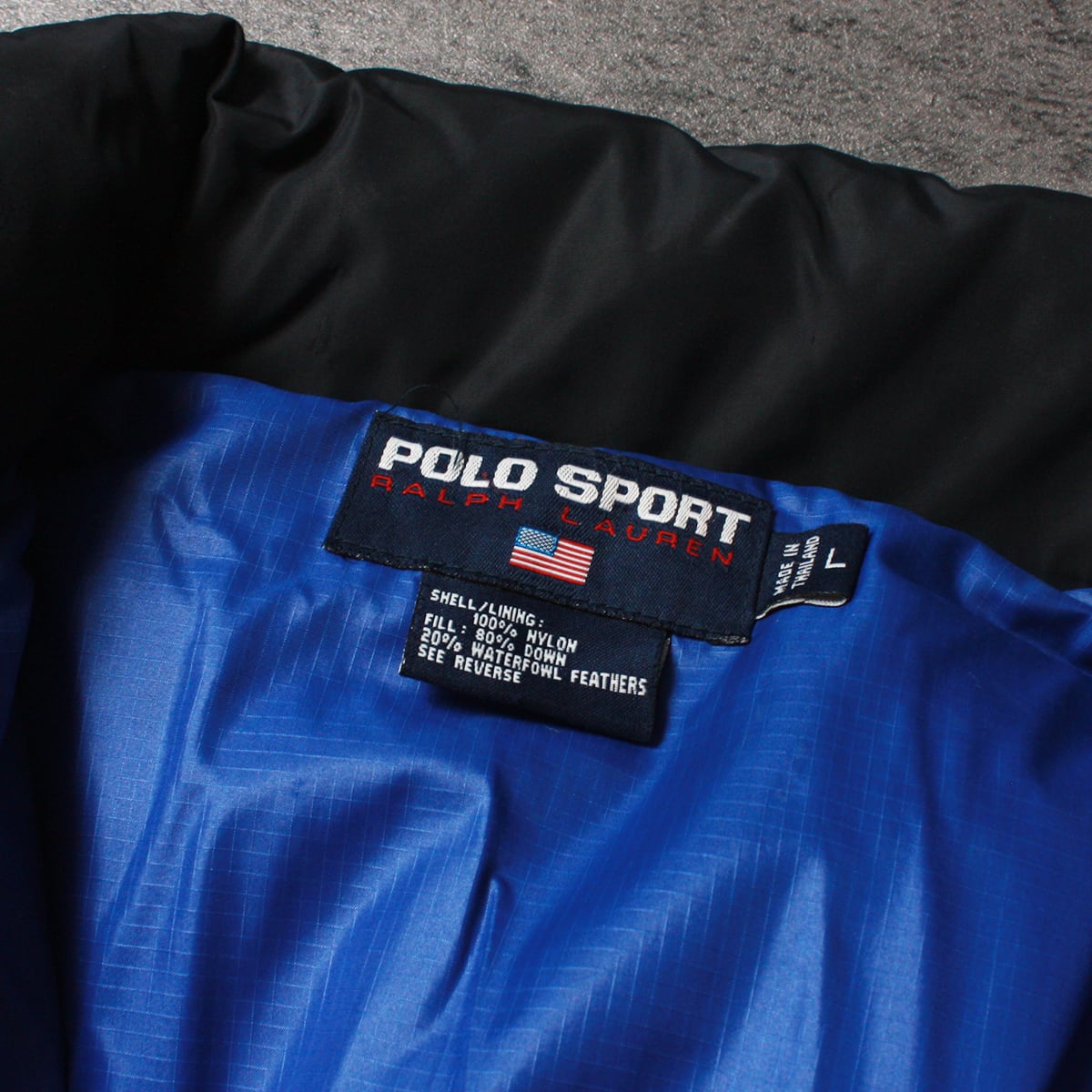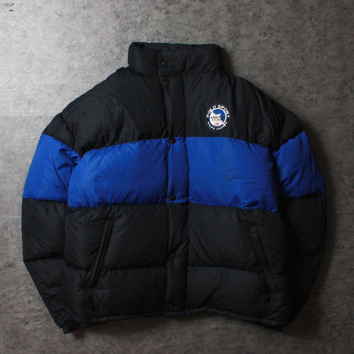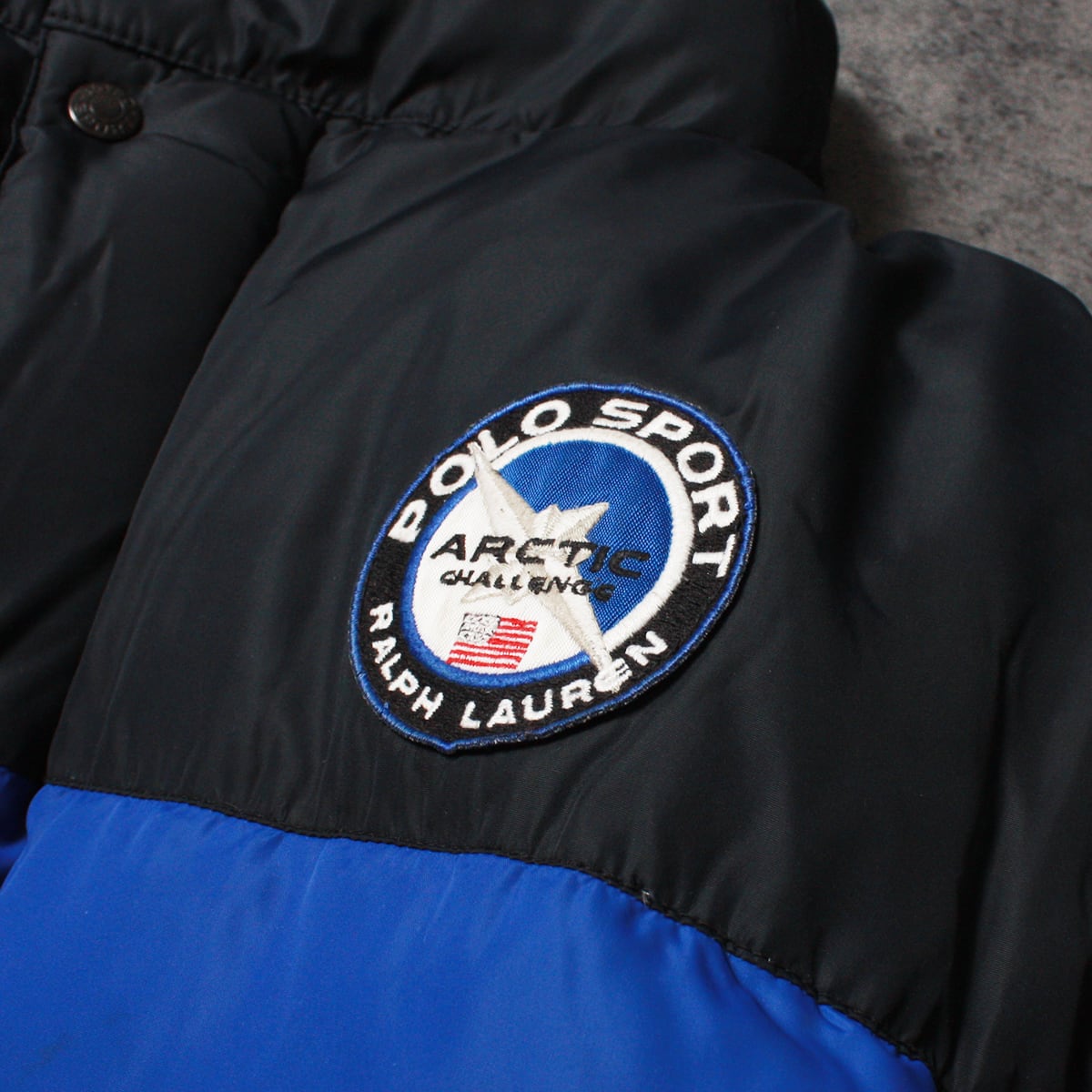 POLO SPORT ポロスポーツのダウンジャケットです。POLO SPORTの中でも極寒のシチュエーションに対応した”arctic challenge”で人気の高いアイテムとなります。ネイビーとブルーの落ち着いた配色に胸元のパッチが」目を引く一品。厚手で防寒性も高く秋~冬に活躍する一品です。