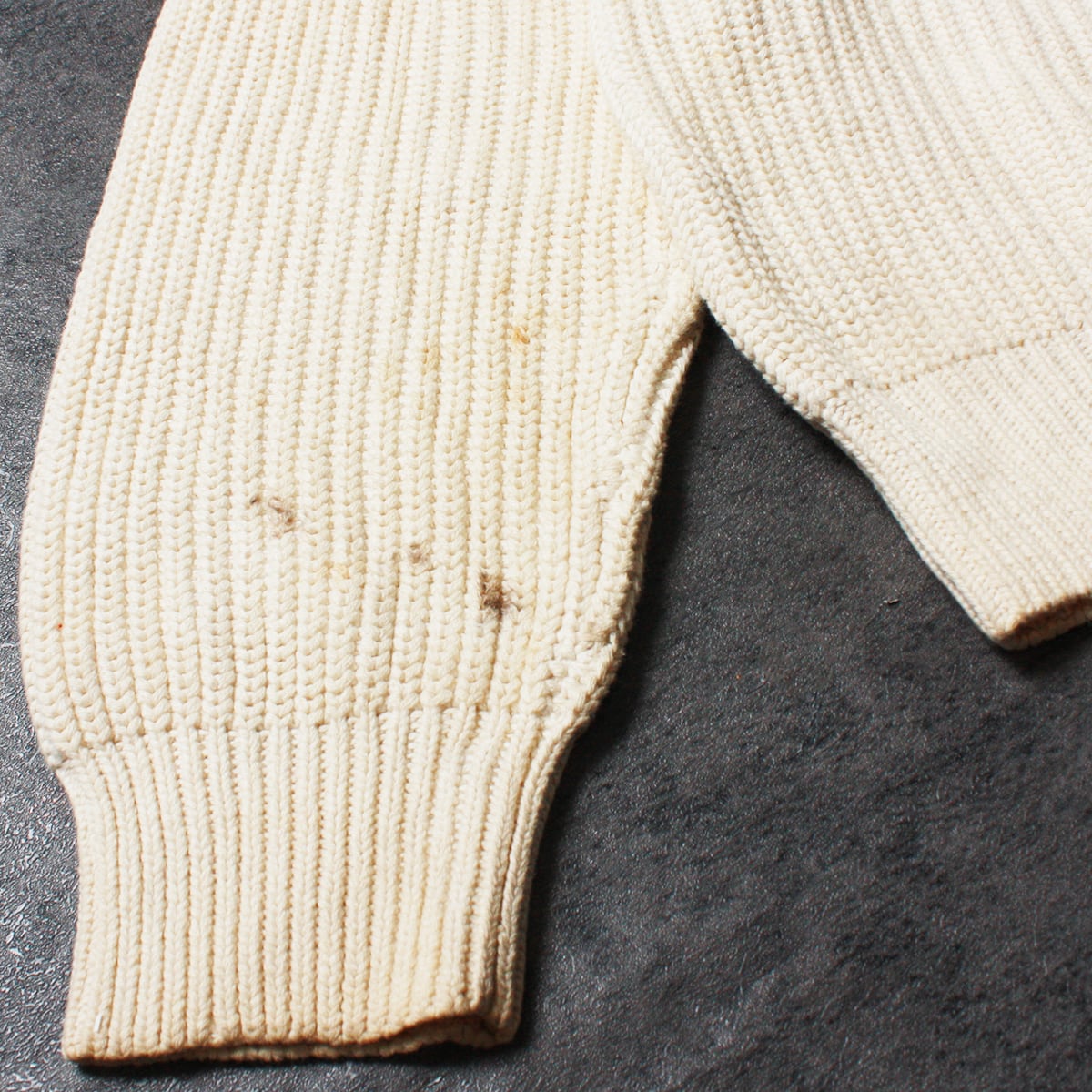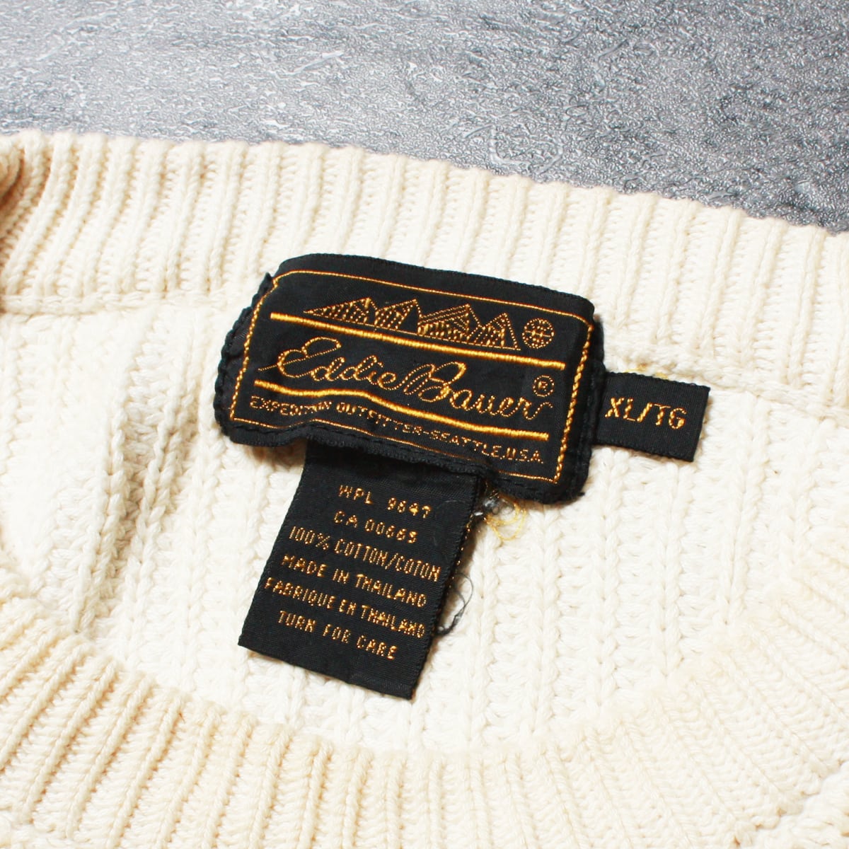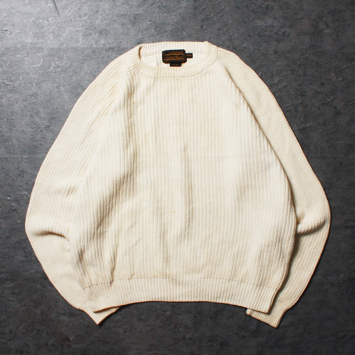 Eddie Bauer エディバウアーのニットです。100年以上の歴史を持つアメリカの老舗アウトドアブランドらしく、機能性、耐久性、そしてクラシックなアメリカンカジュアルスタイルが特徴。腹部、裾、左袖など所々にシミがありますが洗濯して薄くなる可能性があります。穴やほつれはなくまだまだ着て頂けます。