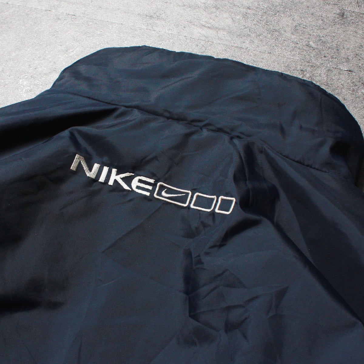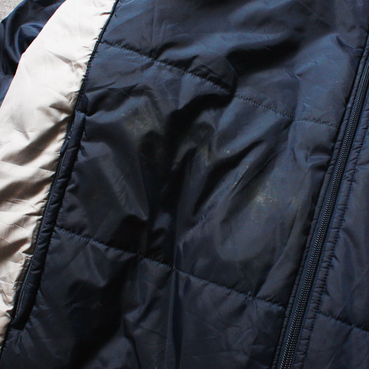 NIKE ナイキ リバーシブルナイロンジャケットです。ネイビー/グレーの表面の腹部にシミ、グレーの裏面の首元、袖もとに汚れがありますが洗濯して薄くなる可能性があります。穴や擦れはなくまだまだ着用いただけます。